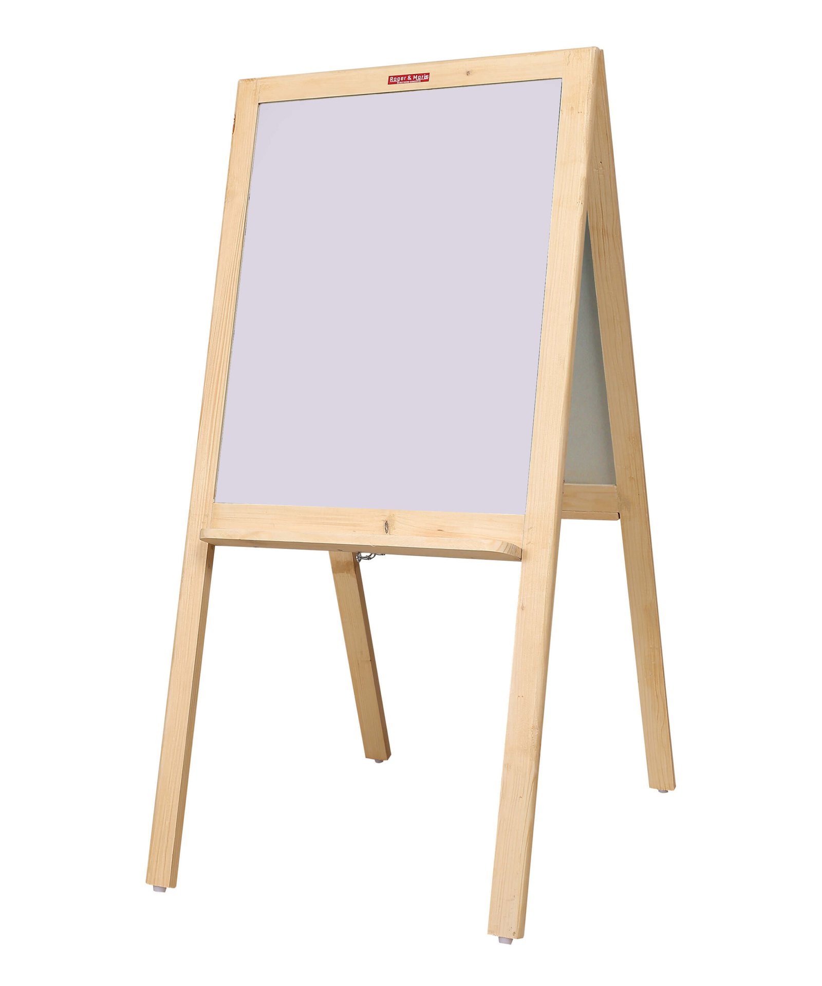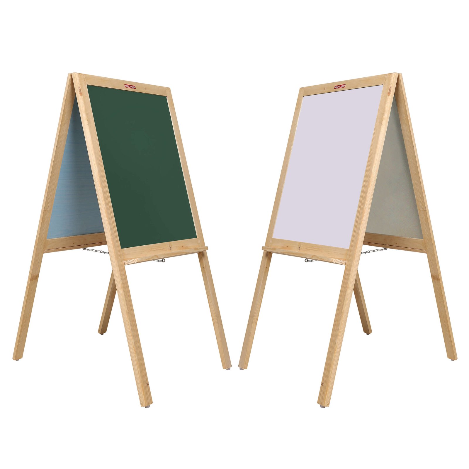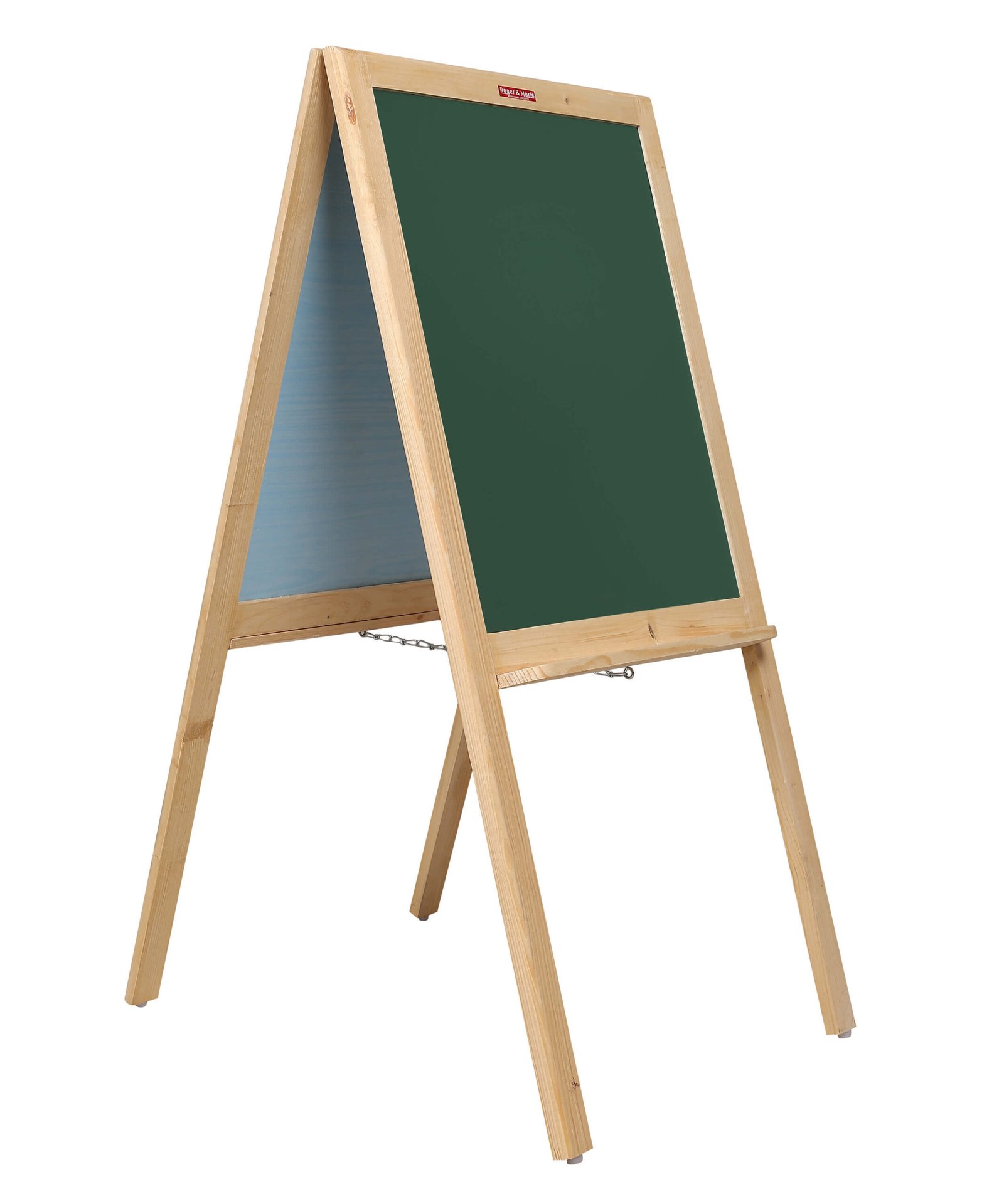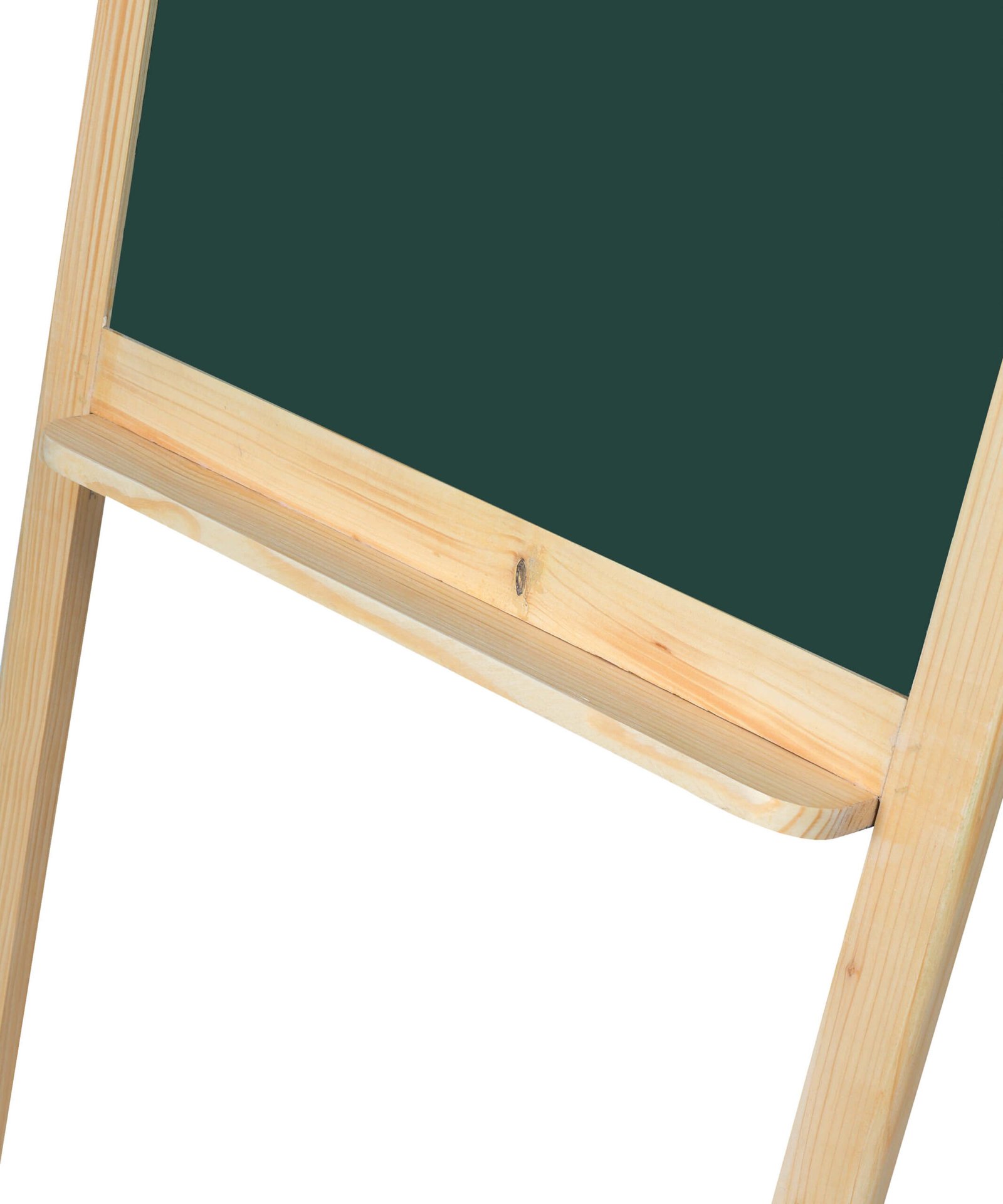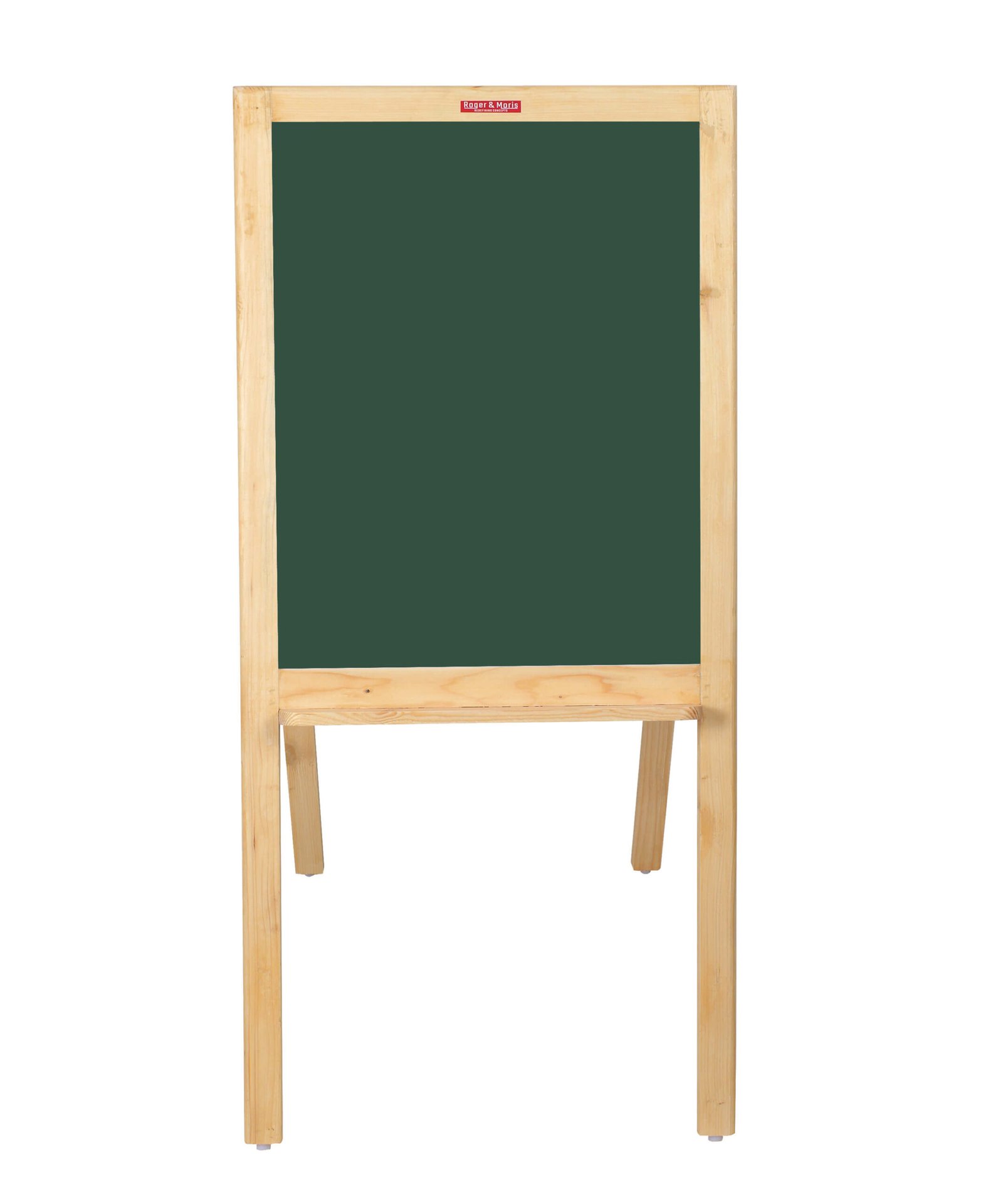 - QUALITY : This board is comes with non-magnetic, spruce wooden frame. It is a great learning tool with white marker surface in front and green chalk surface in back. This double sided easel is a quality children’s’ easel.